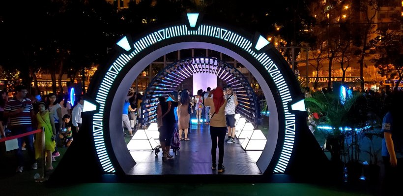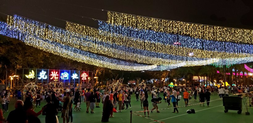 ^ decorations in Victoria Park. The Chinese in the distance is a play on words about photography and the holiday: it translates to, “The full moon is illuminating the earth,” but the character for “illuminating” has been changed to a camera.