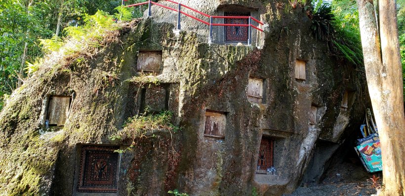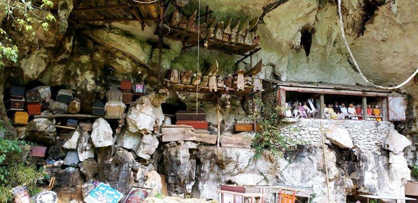 People are often buried in caves after the funerals. The lower levels are reserved for poorer people, and the higher for the upper class. The caves are natural, and Torajans have been using them for hundreds of years.