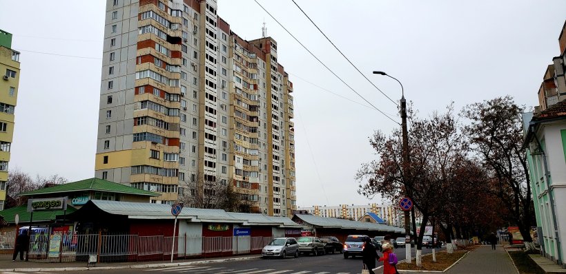 Some Soviet-style condos and street market: