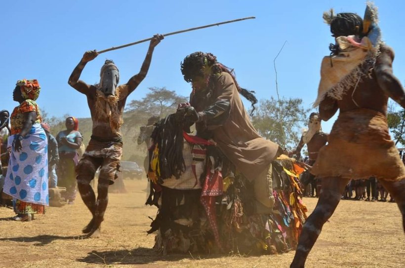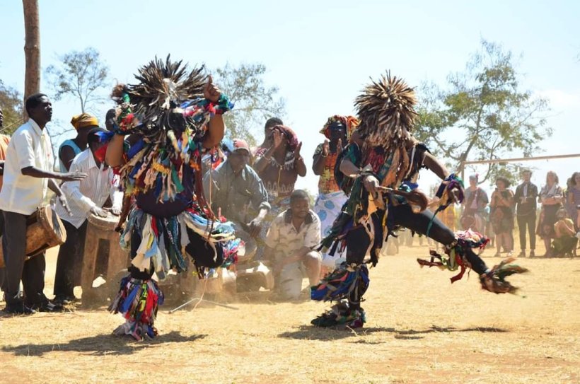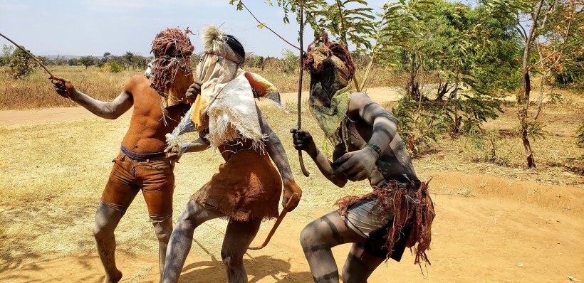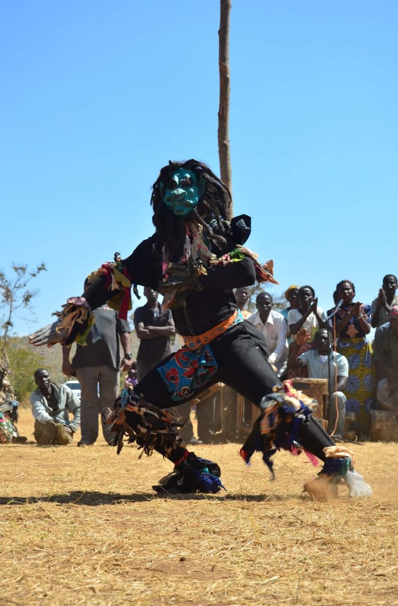 Usually as they run around, they carry thin branches and ask people for money. If you refuse, they hit you with the branch. Women and children are terrified of them, so typically run away. If they come to your house, you should give them a small gift of eggs or soya pieces or another food item. “Gule Wamkulu” literally translates to “Big Dance.” To this end, they also perform dances during special events, such as important football (soccer) matches… Or the Swearing In ceremony for Peace Corps Volunteers!