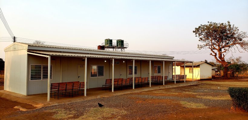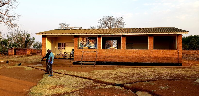 My first few months at site is spent focusing on community integration. To that end, I’ve been spending most days at my health center, interacting with patients or supporting staff in records-keeping or other tasks. I don’t provide any direct care, although I do spend a lot of time weighing babies. The mothers come and wrap the child in a chitenje (colorfully-printed fabric) and hang them from the scale attached to a wooden beam, and I record the information in their health passport. You can see the beam standing on two poles in front of our environment building (it’s called “environment” because it’s the department in charge of outreach services to the community):