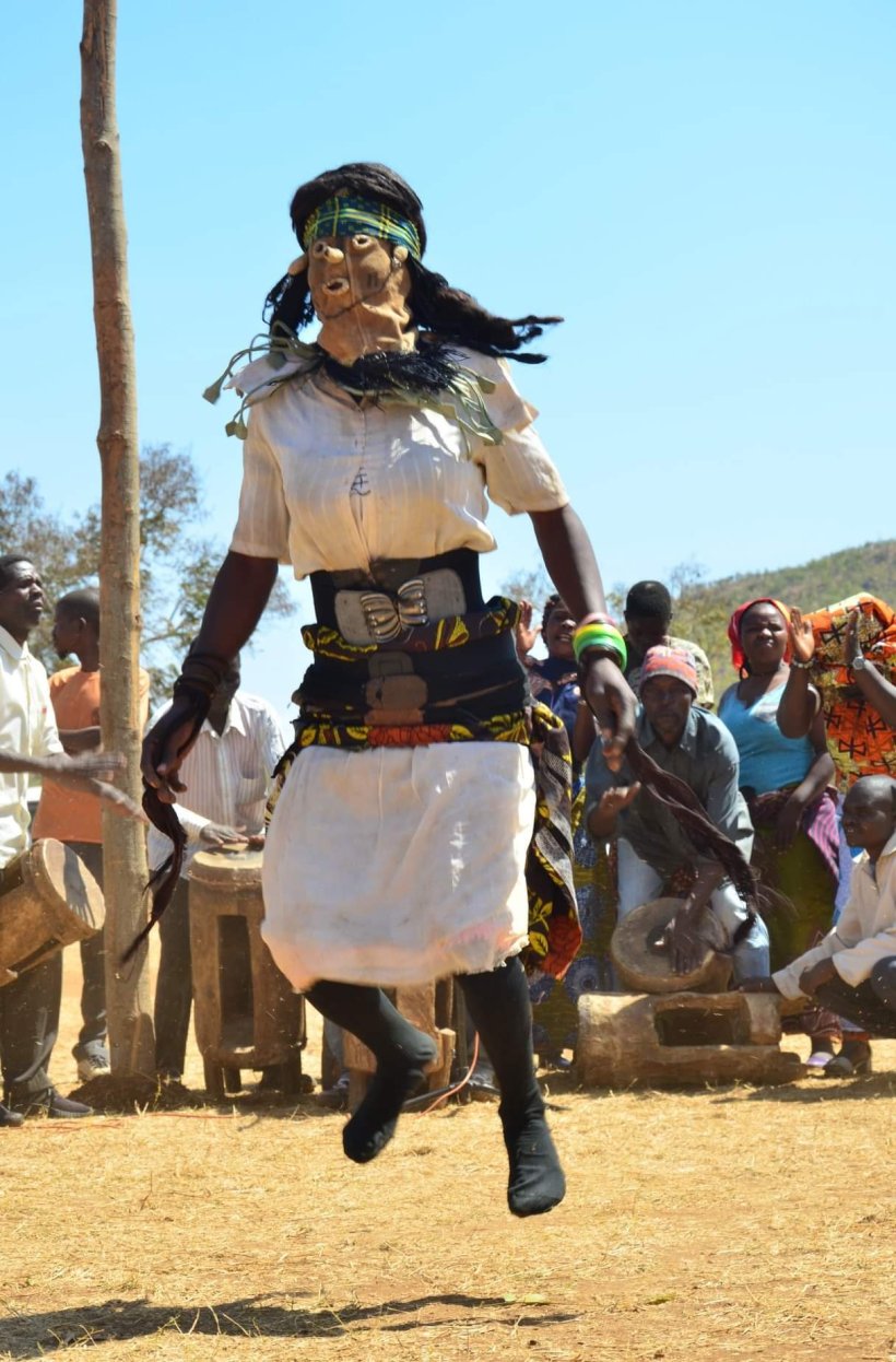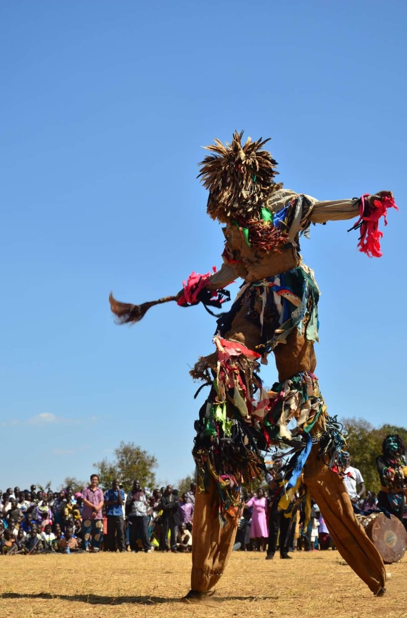 When the Gule Wamkulu perform, they often adopt the costume of an animal, to represent a very powerful or unique individual. The Gule climbing this pole is a squirrel!