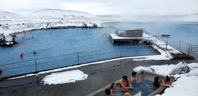Due to the aforementioned geothermal nature of Iceland, taking hot springs is a common pastime! Virtually every town has an area where residents can soak in naturally-heated outdoor baths, often as an area within a recreational facility. There are some larger, more famous hot springs as well, such as the Blue Lagoon near Reykjavík. Towards the end of my road trip, I opted to check out the lesser-known Mývatn Baths up in the north. The water was pleasantly hot and a delicious contrast to the cold air and snow!